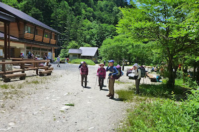 | 上高地から3時間、横尾山荘でうどんを食べ出発 | 西糸屋に帰りの荷物を預けたけどまだまだザックは重い |