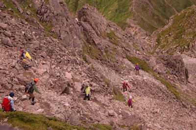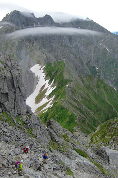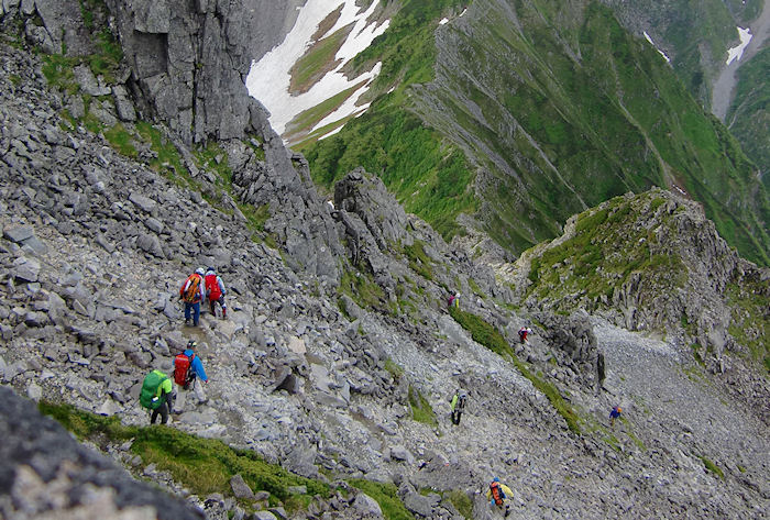 | 獅子鼻直下のガれ場を 久保さんをトップに慎重に下っているのがわかりました |