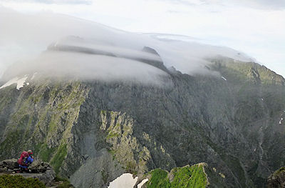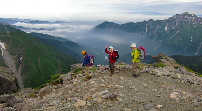 | 天空の北穂高山荘・滝谷・大キレットにいい雲がかかりました さよならした酒井ミが上から3人を撮る |