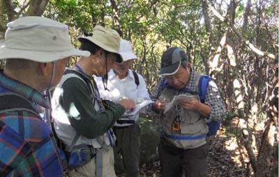 | ★ コース・その他 中山キャンプ場(9:10)~P864(10:50)~前岳(11:30)~昼食~発(12:00)~多良岳(12:30) 登山口分岐(12:50)~ 西岳(13:05)~笹岳(13:40)~中山キャンプ場着(14:50) ★ 参加者 L田中オ・ ・井川キ ・村田・松本・松尾ノ ★ 主な報告 沢沿いの登山道を30分ほど歩き前岳のきたの尾根に向け地図・コンパスを合わせ直登開始、 苦労しながら着いたのが南稜会発登頂のP864mに到着。そこから前岳北東の鞍部を経て、 急坂を一気に登り前岳着。初めて登山者と合う。 昼食後アップダウンを数回繰り返し、多良岳・西岳を通り笹岳の頂上着。ここでIgawaさんからMathuo‐noriさんへ トップを交代 中山キャンプ場に地図・コンパスを合わせ藪こぎ開始。 Tatuoさんの的確な判断で迷うことなく、目指す中山キャンプ場に到着。