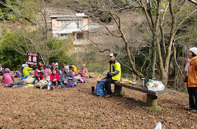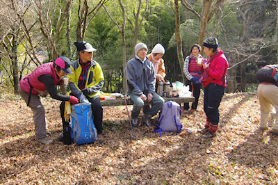 | 妙相寺広場で昼食 | Chiekoさんが熱いコーヒーと手焼きのクッキーでお接待 |