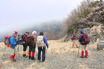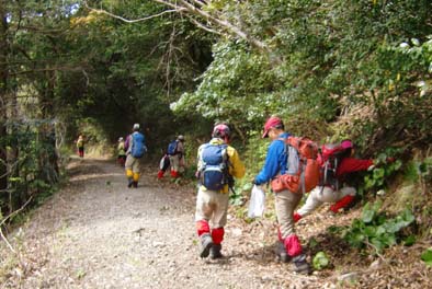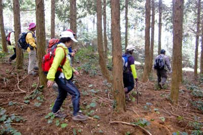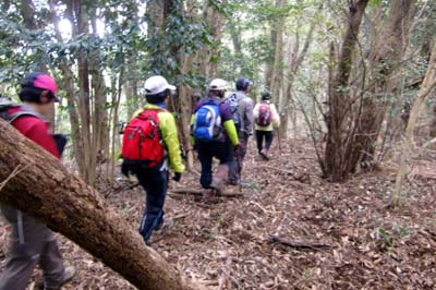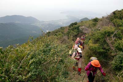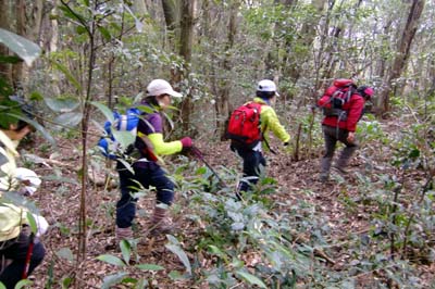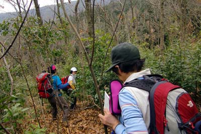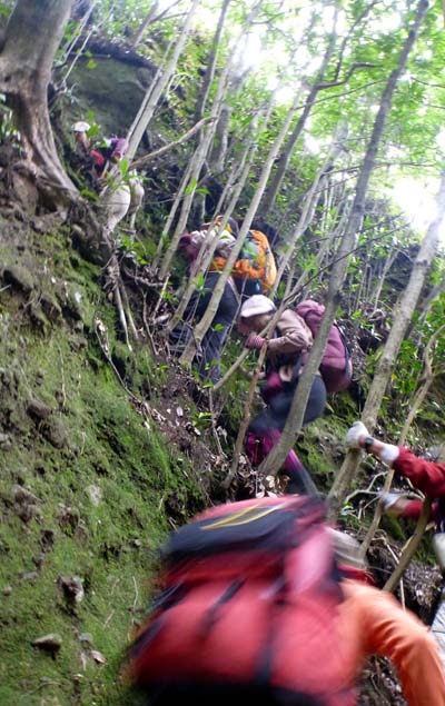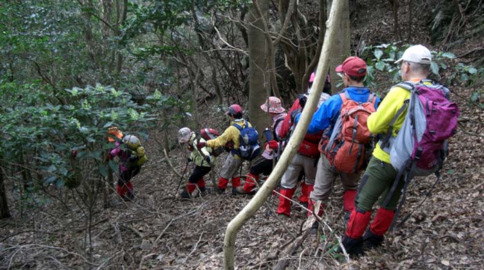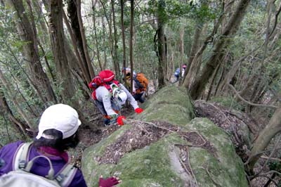 | 鉢巻山の下り 急下降で足元が不安定、枝木を頼りに 井川さん撮影 | |