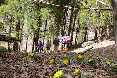 | 福寿草をスケッチする邦子さん | 振り返り振り返り見納めです |