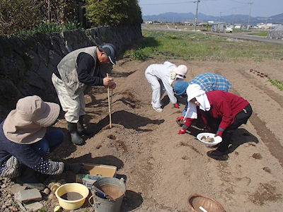 | じゃがいもに灰をまぶせ植える準備です 畝に植え込んで (松本農園) | |
