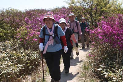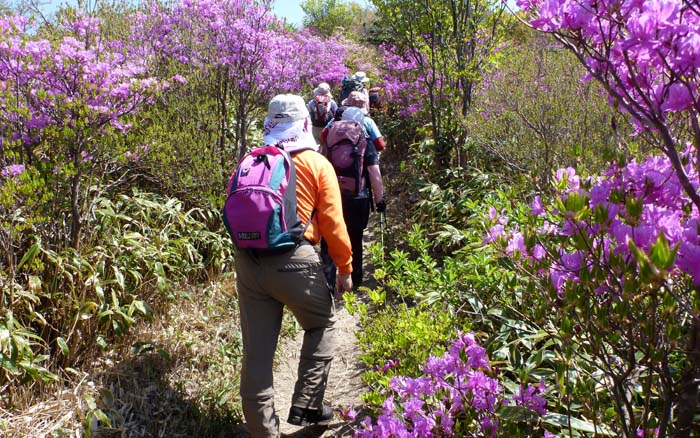 | ★ 参加者 L松尾ア 田中オ・村田・中村・吉田・酒井マ・酒井ミ・林田 会員 8 名 ★ コース・その他 長崎発7:15〜佐賀 古場登山口発9:35〜井原山(10:30)〜雷山(12:15〜12:55)〜古場登山口14:55 ★ 主な報告 ・古場登山口は縦列駐車の車でいっぱい 県外ナンバーの車・車 登山道はミツバツツジのトンネル、 青空にピンク・赤紫のミツバツツジがひときわ映えます 行きかう人の多さ、 誰が付けたか井原山ラッシュ |