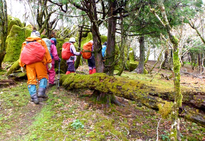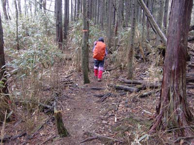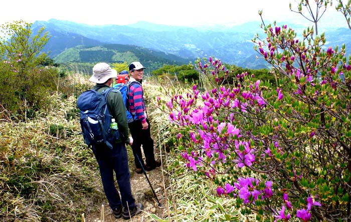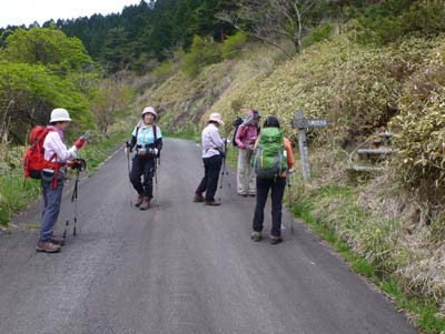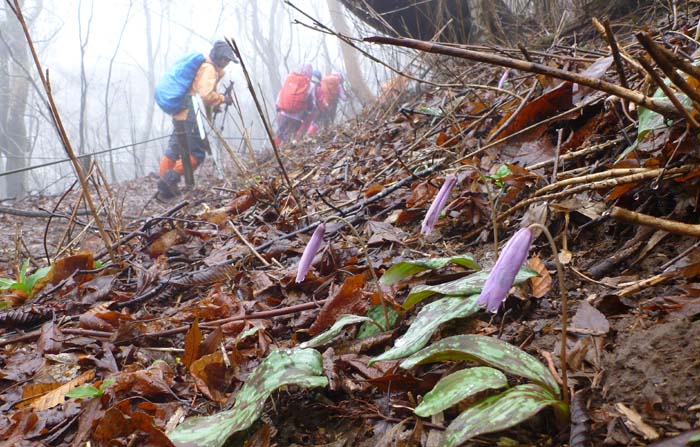 | ★ コース 二本杉(9:40)~雁俣山(10:50)~黒原分岐(12:30)~京ノ丈山(14:25)~ 黒原分岐(16:00)黒原(16:30)~黒原分岐~二本杉(17:10) ★ 参加者 L田中オ 中ノ瀬・酒井マ・酒井ミ・井川キ・林田・ 計6 名 二本杉では山開きの神事が行われている。 霧雨の中、二本杉登山口出発、車が1台のため縦走のピストン となる。 かなり時間がかかりそうで皆、覚悟を決める。 カタクリの花は雁俣山への登山道で両サイドに見られるが、蕾が固くそっくり返る花はまだこれからのようです。 雁俣山~京ノ丈山の縦走は皆初めてです。どんな縦走路だろうとわくわく。登山道はスズタケが刈られ歩き やすい。 雁俣山からの50mの直下降、ロープはついているが足元はぬかるみこれに苦戦。黒原分岐を過ぎてからゆる いアップダウンの縦走路、京ノ丈山頂までは4時間45分を要した。 これからピストンで戻る、黒原分岐で民家 が1軒ある黒原まで下り、再び山道に入り、二本杉登山口へ。 7時間30分の縦走路でしたが、白いコブシの花・ヒカゲツツジの蕾・シャクナゲ・山シャクヤク・カタクリに元気を もらい、 皆元気に歩き通しました |