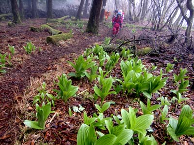 | 黒原分岐からトップを引く井川キさん | バイケイソウの群生の中を |