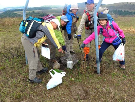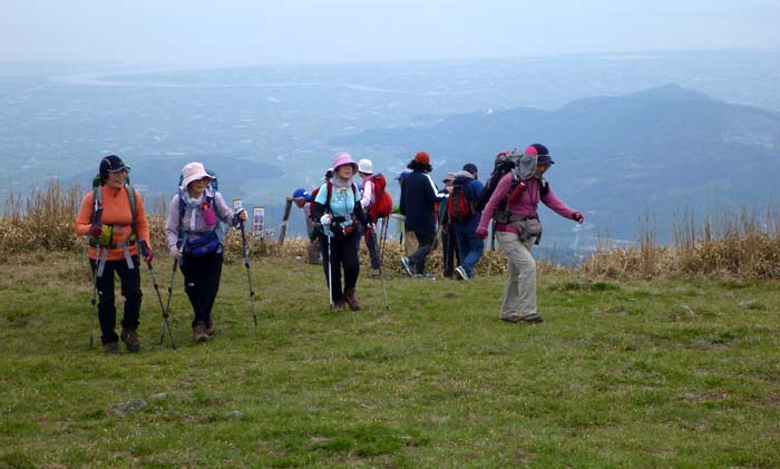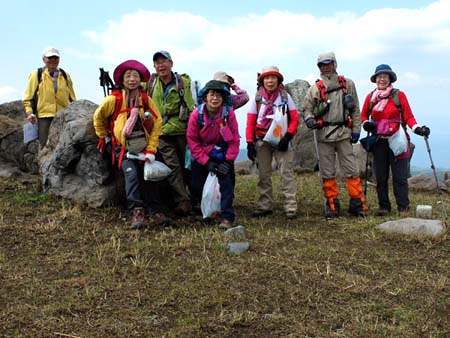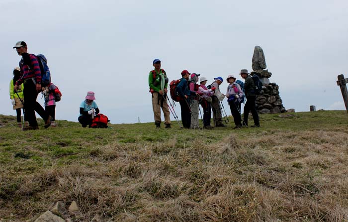 | ★ コース 岸川バス停発(10:05)~岸川登山口(11:40)~天山鞍部昼食(12:20~13:15)~ 天山山頂(13:50~14:05) 七曲峠着(15:25) ★ 参加者 L久保 田中オ・中ノ瀬・酒井マ・酒井ミ・井川ノ・井川キ・井上・林田・松尾ノ 計10 名 七曲り峠に車をデボし岸川バス停へ移動 心配された天気は薄曇り、時々はおてんとうさまも顔を出し歩くには上々、お楽しみの《岸川饅頭》を食べ 帰りに持ち帰りの注文をして歩き始める 車道歩きのあとは取り付きから丸太の階段・ゴロゴロ石道歩き だだっ広い天山山頂は360度遮るものなし 足元には小さなバイカイカリソウが可愛い、ミツバツツジはこれからです |