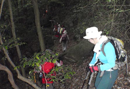 | ★ コース 蛍茶屋電停発(9:05)--彦山展望岩着(10:50)--日吉青年の家着(12:20)~昼食~発(12:55) --日見峠(明治新道)着(13:45)--蛍茶屋着(14:45) ★ 参加者 L久保ヒ 田中オ 吉田 松尾ア 久保ク 前田 中ノ瀬 伊藤 中原 井上 木田・井川キ 中村ア 林田 島田 松本 ・蛍茶屋を出発し彦山(豊前坊)登山口からすぐ右手に急登開始。1時間30分ほどで ・蛍茶屋を出発し彦山(豊前坊)登山口からすぐ右手に急登開始。1時間30分ほどで 彦山の展望岩に到着。遠くに甑岩方面を眺めながら、小腹ごしらえ。 ・日吉青年の家のそばで昼食ののち日見峠へ ・途中、道路際のジューシーなヒワをゲット。食べながら歩く。日見峠の新茶屋跡で 集合写真。旧街道を1時間歩いて蛍茶屋に到着した。 |