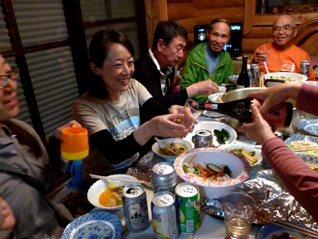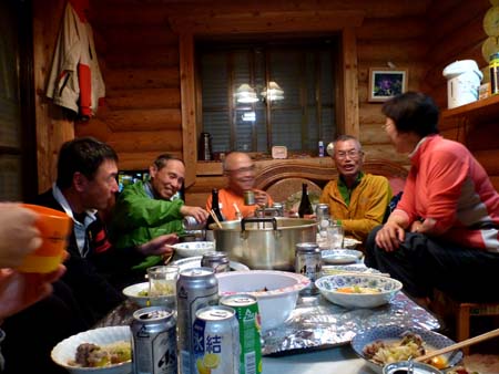 | お土産のお酒美味しかった | 田中さん持参の大鍋ですき焼き 炊事・宴会部長の和ちゃんが仕切る |