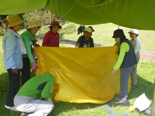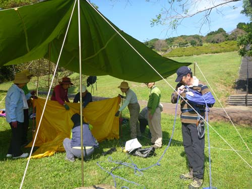 L 泉 田中オ・吉田・松尾ア・前田・酒井マ・酒井ミ ・田中チ・久保ヒ・久保ク島田・松尾ノ ★ 稲佐山でテントの虫干し ザイルワーク 今回は権現岩は中止 |