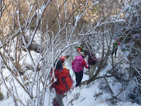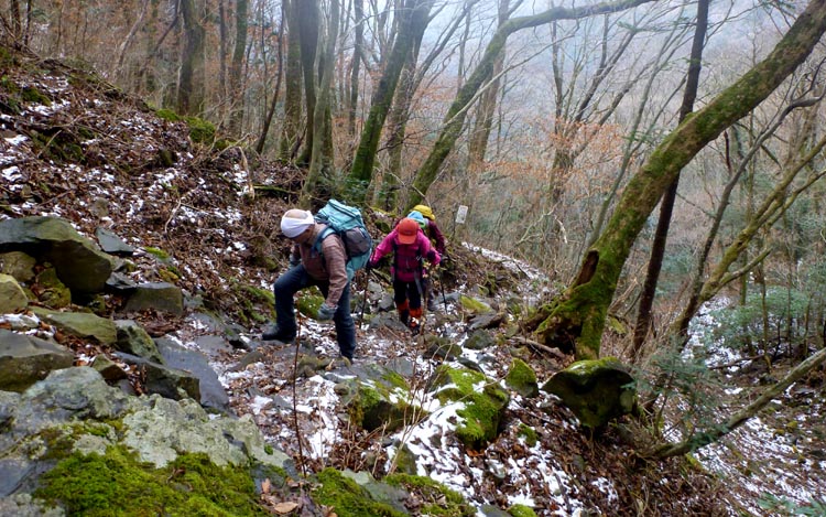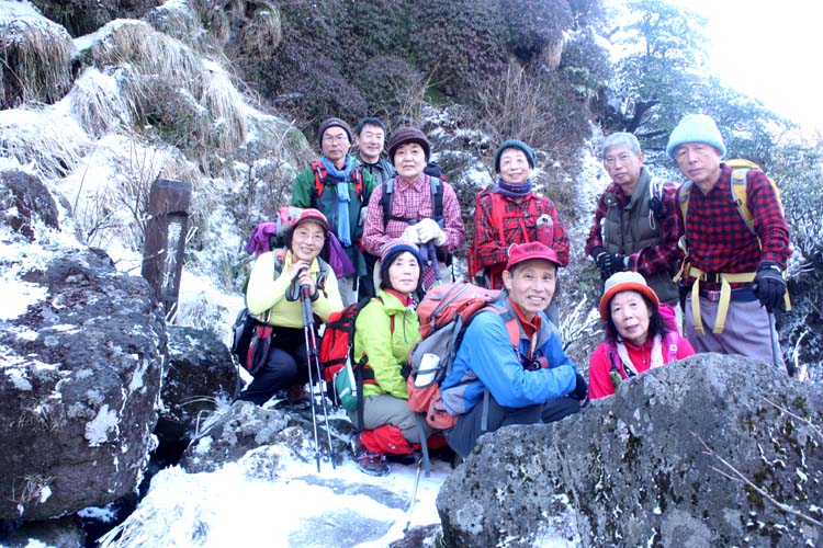 ★ コース 黒木(8:30)~金泉寺(10:35)〜多良岳(11:25)〜鞍部〜六体地蔵〜金泉寺〜西ノ越〜黒木(13:50) お正月気分が抜けない4人、餅太りで体力が危ぶまれる4人、ゆっくり・ゆっくりの歩行。 大払谷にはまだまだシャーベット状の雪が残っています。 でもアイゼンを付けるまでもなく安全歩行で 新春登山ができました。 |