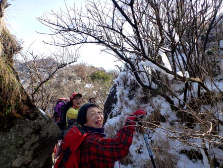 ★ コース 池原駐車場(8:40)~仁田峠出発(9:25)~妙見神社~分岐~霧氷沢~雲仙普賢岳(12:00~12:30)~ あざみ谷~仁田峠駐車場(13:40) いいお天気になり雪は無理だろうと思っていましたが、なんの妙見神社アイゼンを装着、 霧氷沢は期待どおりの雪・雪でした |