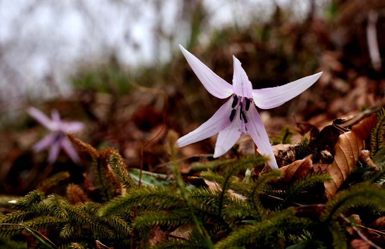 ★ コース 二本松登山口発9:50~雁俣山11:05~黒原分岐~京ノ丈山(14:25~14:45)黒原分岐16:45 ~ 二本杉駐車場着17:05 心配された天気もなんのその、晴れ間が見え期待のカタクリの花に歓声があがる。 足元はふかふかの登山道、雁俣山からの痩せ尾根には薄黄色の日陰ツツジが色を添える。 大下りは今年は難なく通過、 京ノ丈山山頂付近のカタクリは私たちの期待に答えてくれました。登山道はヒメシャラ・ブナの新芽が緑のシャワー |