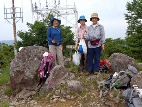 L 酒井ミ 久保ヒ・松尾ア・中ノ瀬・酒井マ・前田・島田・久保ク・中村・林田・中原・松尾ノ・木田 ★コース 第2吹き越し9:20~分岐10:40~紅葉茶屋~普賢岳11:45~12:20~紅葉茶屋~登り返して尾根へ~ 分岐~吹き越し駐車場14:10 梅雨からの久々の天気、夏山に向けての歩荷、背中のザックがこたえます。 |
