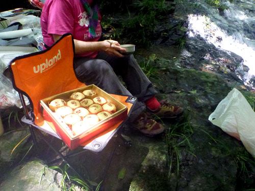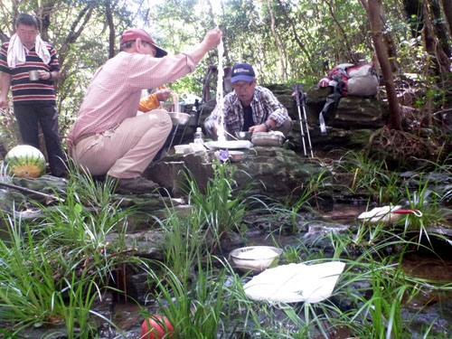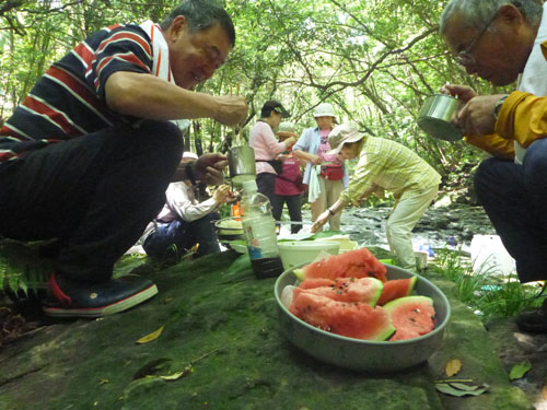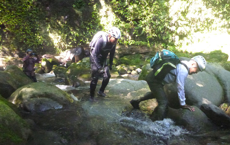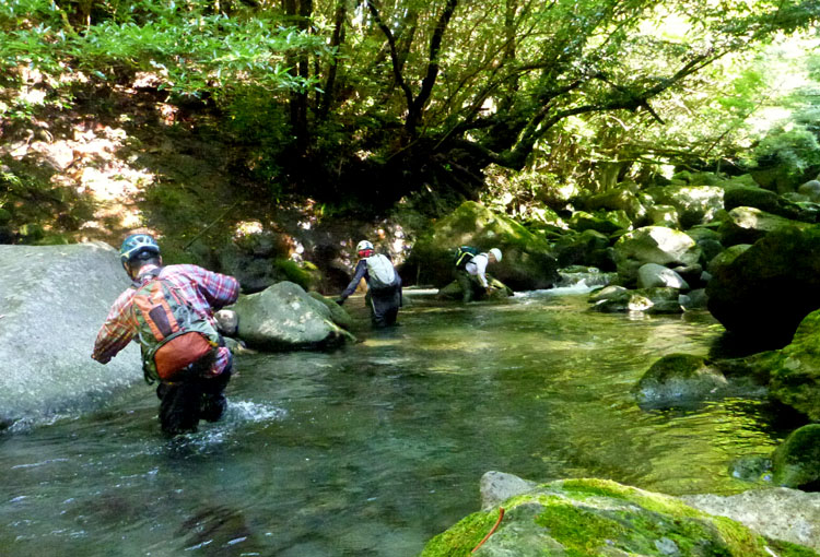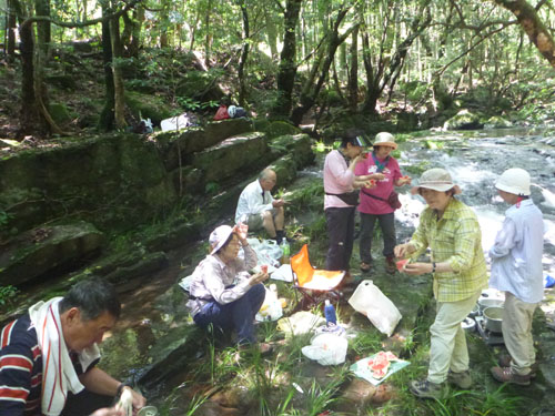 L 田中オ 久保ヒ・松尾ノ L 前田・中ノ瀬・酒井マ・酒井ミ・田中チ・中原・林田 シュウさん・モモさん・ノリさんの3人が銀嶺渓へ沢登り 5人が写真を取りながら沢沿い歩き ナウさん和ちゃんは早くにソーメン流しの準備でした |
