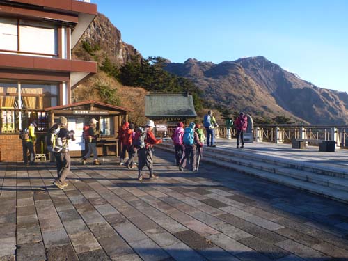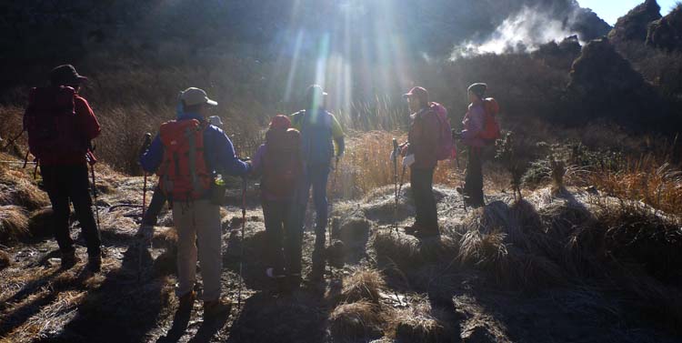 | ★参加者 L=前田 高平レ 田中オ・松尾ア・中ノ瀬・酒井マ・酒井ミ・田中チ・久保ヒ・久保ク 井川ノ・井川キ・林田・松尾ノ・島田・高平ノ・福浦・本村 18 名 10日(土) 忘年会 雲仙青雲荘 ★コース 11日(日) 仁田峠出発(8:15)〜あざみ谷〜紅葉谷〜新道〜霧氷沢〜 普賢岳山頂〜紅葉谷〜あざみ谷〜仁田峠(11:45) |