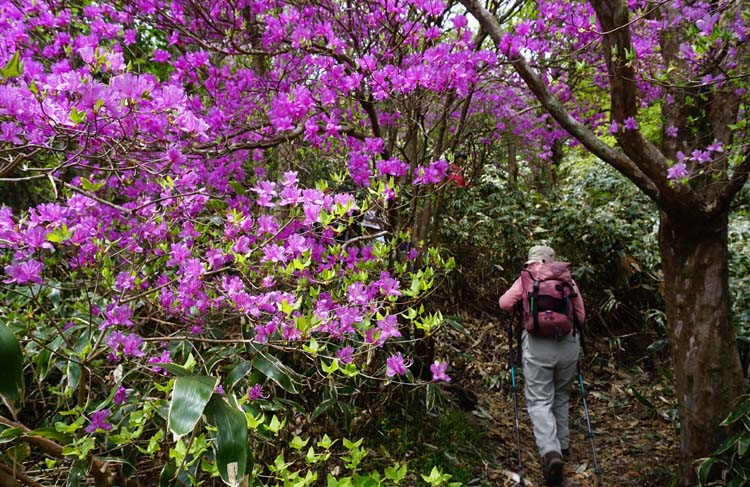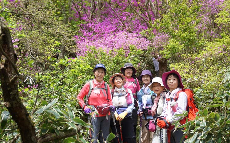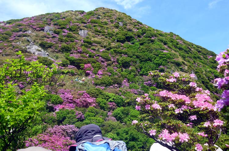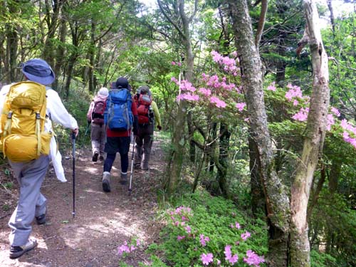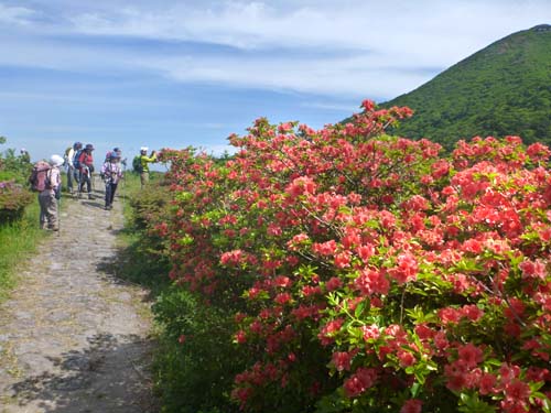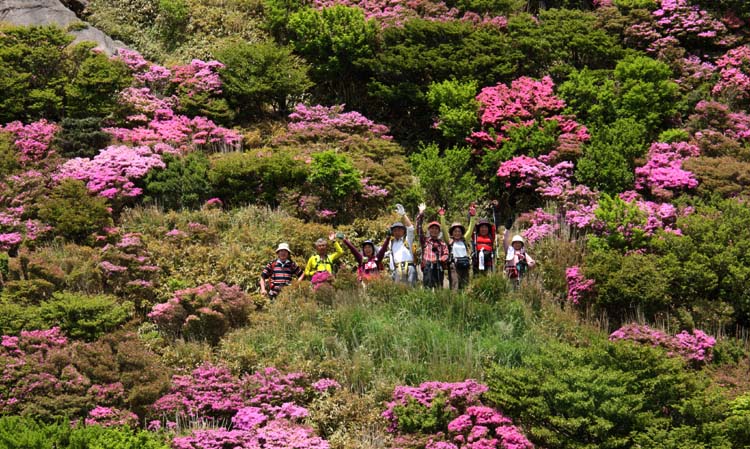 足元はふかふか、両サイドはミヤマキリシマ、ここは初めてという方が5名で山頂からの素晴らしい眺望に声があがりました。 妙見尾根は満開 国見岳斜面は渋滞のようです。 帰りは温泉でゆっくりしました。 |