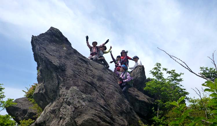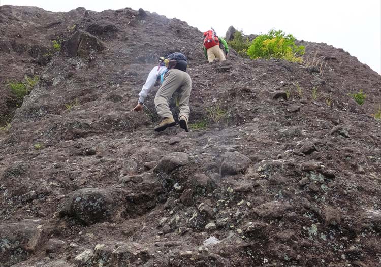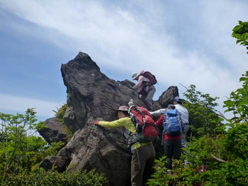 | 奥に妙見岳 見えるようにちょっと身体を傾けてもらいました | 慎重に登りあがる |