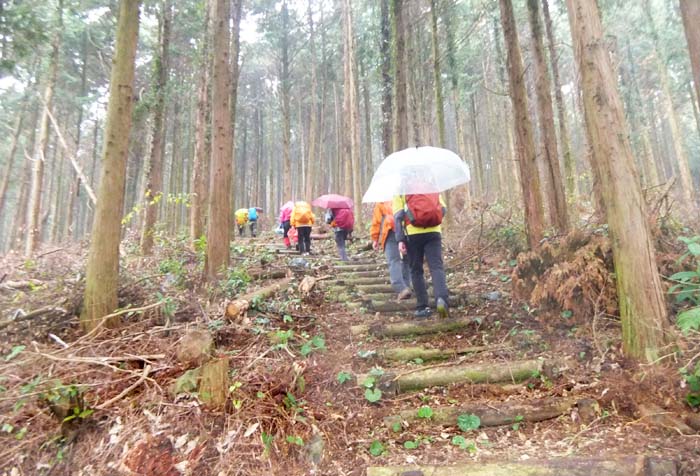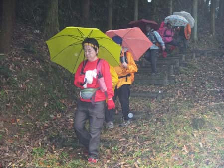 ◆参加者 L 本村 田中オ・松尾ア・中村・林田・高平ノ・高平レ・松尾ノ・ 会員8 名 ◆コース 土師野尾スタ-ト・8:41分~碁盤の辻・9:52分~県道峠・10:30分~花の木・1044分~井樋のお尾観音・11:40― (昼食)~福瑞寺到着・13:14分 九州自然歩道:土師野尾~福瑞寺(12.3km)。 曇り空・霧雨・小雨とあいにくの天候の中決行。でも強い雨にはあわず「花の木」辺りでは種々の花々を堪能、 更には木の実を収穫(?)するシ-ンもありました。 |