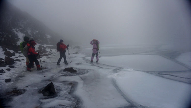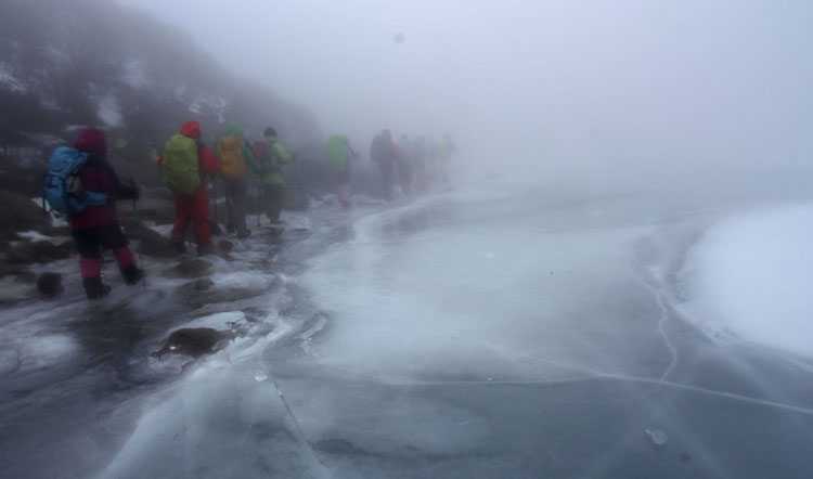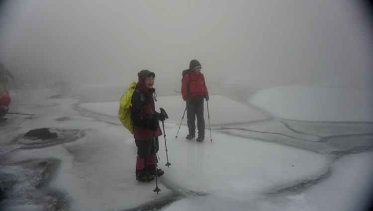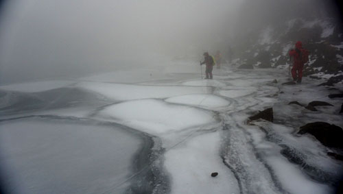 天気予報は曇り・雨 牧ノ戸峠からづっとガスっています。足元は雪・氷が解けだしシャーベット状 時折強風にあおられる。 御池の氷は今まで見たことのない表情を見せてくれました |