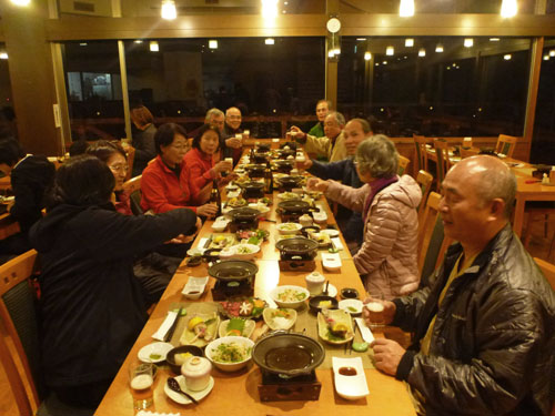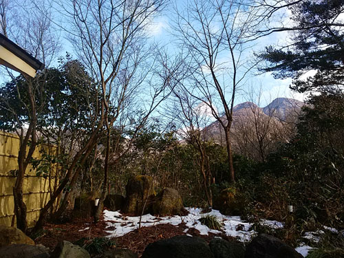 山を下りて前泊の《花山酔》で温泉入浴 露天風呂から三俣山がくっきりと