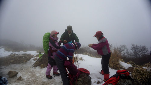 最後のグループの到着を山頂の下で待つ |