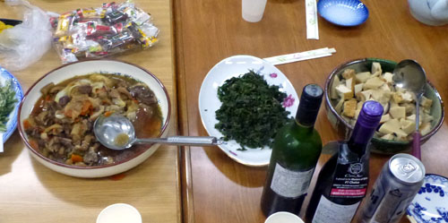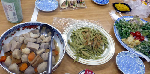 女性二人で夕食を作って下さっています サトイモ・イタドリ・山菜天ぷら・昨日獲れたイノシシの煮もの・クサギノ若芽・タケノコは美味しい味付けでした