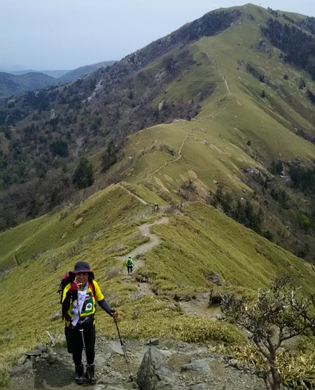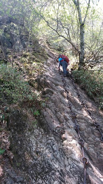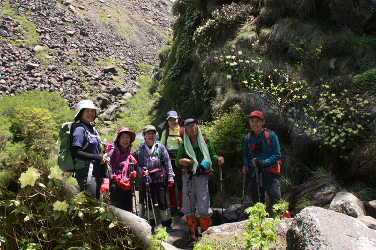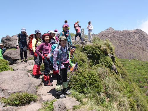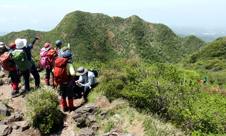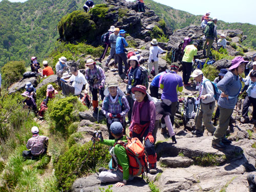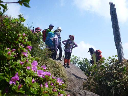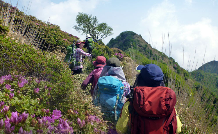 ◆参加者 L酒井ミ 松尾ア・酒井マ・伊川キ・久保ヒ・久保ク・湯前 会員 7 名 ◆コース 仁田峠〜妙見尾根〜国見岳〜国見尾根〜鬼人谷〜霧氷沢別れ〜霧氷沢〜普賢岳〜アザミ谷〜仁田峠 今回も国見山頂から国見尾根を行く、ツツジの見頃とあって登山者が多い、尾根から国見岳を振り返ると こっちをじっと見ている様子がわかる 普賢岳山頂で、『あの尾根を行かれていた人たちですね 行けるのですね』 『はい!』 霧氷沢のヒカゲツツジは満開、崖にへばりついたように咲く薄緑色のヒカゲツツジに感嘆の声 |