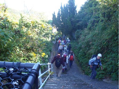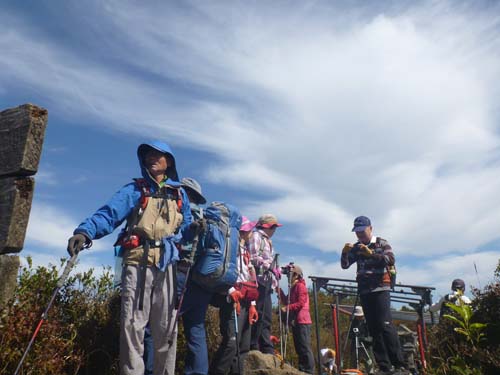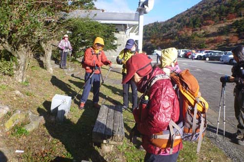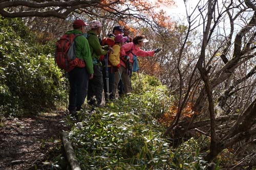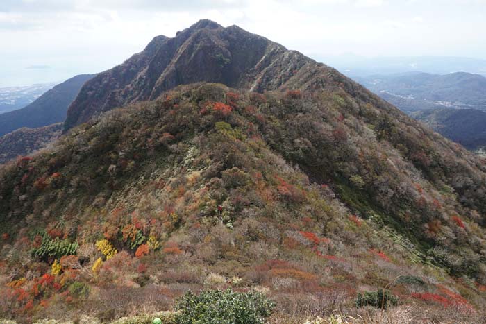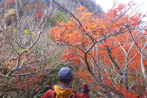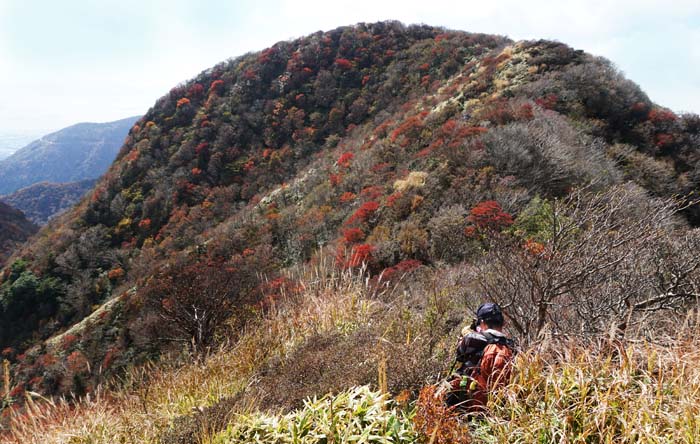 ◆参加者 L 酒井ミ・ 中ノ瀬・酒井マ・久保ヒ・久保ク・高平ノ・高平レ・松尾ノ 会員8名 ◆コース・その他 仁田峠(8:30)〜野岳〜仁田峠(9:30)〜あざみ谷〜紅葉茶屋〜新道〜鬼人谷奥(11:10)〜 国見北尾根〜国見岳(12:20〜12:40)〜妙見尾根〜仁田峠(14:00) 仁田峠は紅葉シーズンで混雑が予想され9時集合を早めに循環道路を通過することに ゲートを7時50分に通過、3台難なく駐車 今回は野岳に登り、仁田から紅葉茶屋〜新道途中鬼人谷奥から反時計回りの国見北尾根を 登りあげることに。 この尾根はなかなか手強かった。 国見岳山頂からの紅葉を堪能しました |