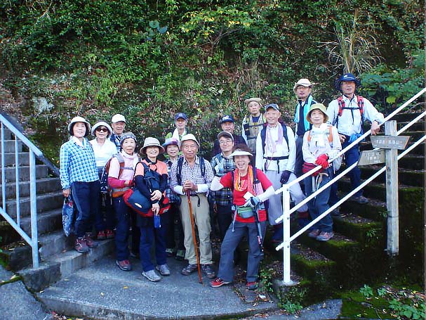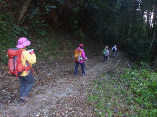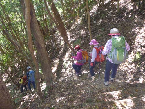 ◆参加者 L 井川キ 田中・中ノ瀬・酒井マ・酒井ミ・久保ヒ・久保ク・井川ノ・松尾ノ 会員 9 名 ◆コース・その他 秋晴れが続くいい日、県連虚空蔵山のNo5に挑む 狭くなっていく林道の石を除けながら走行 のっけからやぶ漕ぎ、地図・コンパを頼りに、急登を登って尾根にあがる。 |