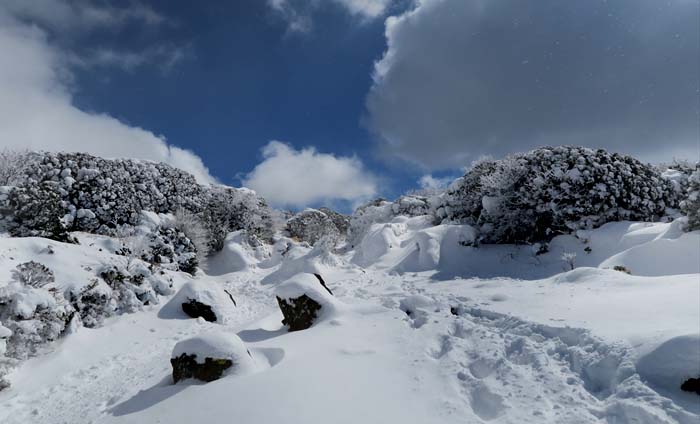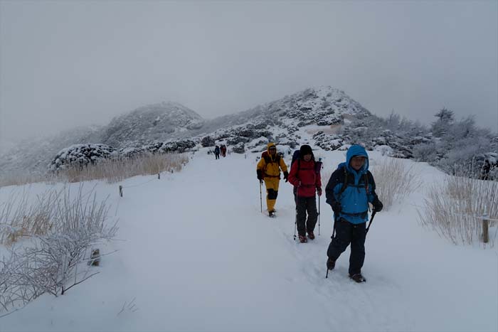 ◆コース 1日目 花山酔泊 2日目 牧ノ戸〜避難小屋〜くじゅう別れ〜御池〜強風のためここから引き返す |
