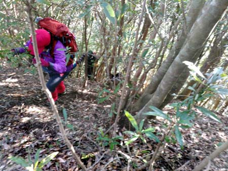 目的の一つが「地図を見て歩こう」。下山開始13:28~籠立場着14:32~喜々津駅着15:32. 2月の山行計画の井樋ノ尾岳「地図コンパスの実地学習」が雨で中止になったのを受け、 今回は喜々津駅から井樋ノ尾岳へ地形図を基に登ることを考える。 長崎街道へ入ってすぐ軽車道~徒歩道、更に250mのコルへ登り 尾根伝いに354mのコルから頂上を目指すとの想定をすも徒歩道へ 入った途端電気柵に行くてを阻まれる。行くての先々に電気柵が見られ、安全の為ルートを変更。 長崎街道籠立場前から軽車道(林道?)の終点迄行き、そこから尾根を探して山頂を目指す事