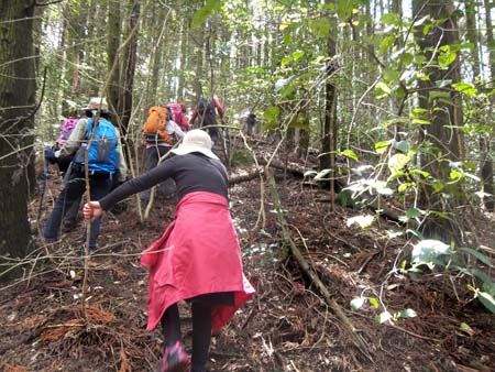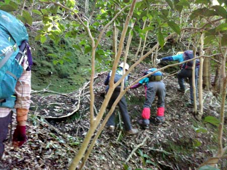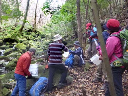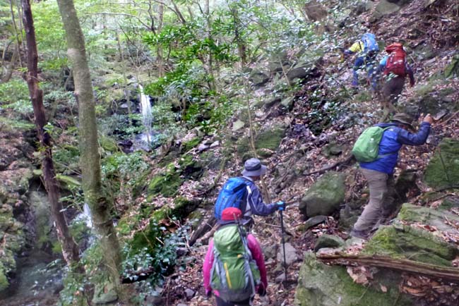 ◆コース・その他 中山キャンプ場9:25〜日暮らしの滝10:10〜笹岳12:05〜中山越13:15〜林道〜 中山キャンプ場着14:00 今回の日暮らしの滝は全員初めて 出発前地図とコンパスで入念な打ち合わせ 沢沿いの足元は危険極まりない 日暮らしの滝はネットで見ていた通り沢を詰めた箇所 ここから笹岳へ向けて浮石だらけの急登を丁寧に登る。 Lの井川さんは何度も何度も地図を読む、松尾ノさんもYAMAPでお助け。 |