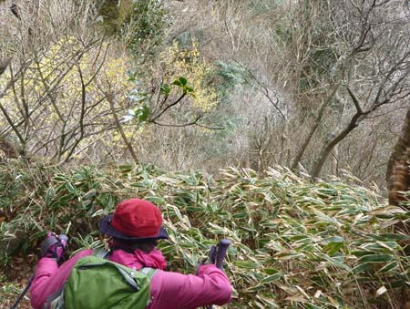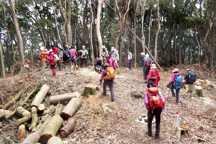とする。終点は沢で右手の尾根に登りたいが斜面は急で水を含んでおり安全な道を探しながら 沢沿いを暫く歩く。滑り易い坂と藪こぎでやっと尾根道に乗り山頂へ。帰りは山頂で出会った 鎌田氏の先導で籠立場のすぐ近くの林道へ出る。 それからは長崎街道の峠・旧茶屋の古井戸前を通り喜々津駅へ。 曇り空に太陽も顔を出し寒さも気にならない程度で、道々に桜も咲きだしており いろんな花も見られました。 |