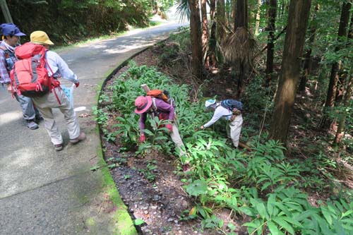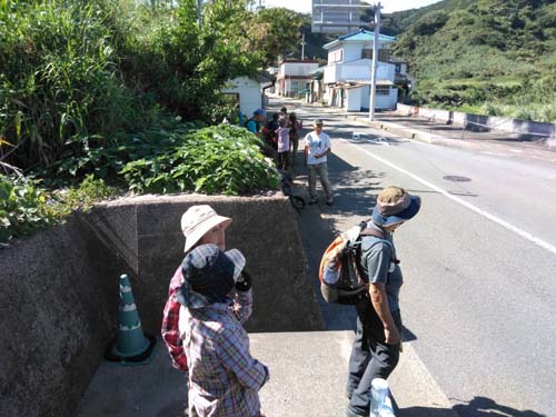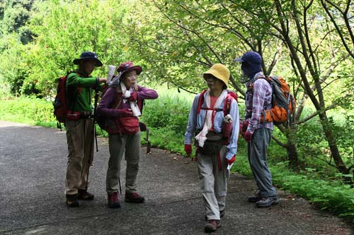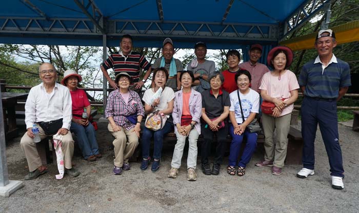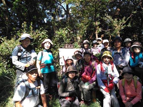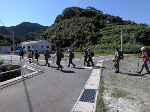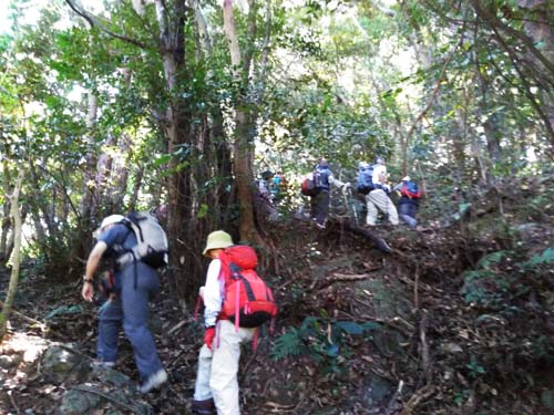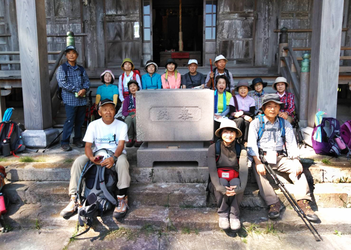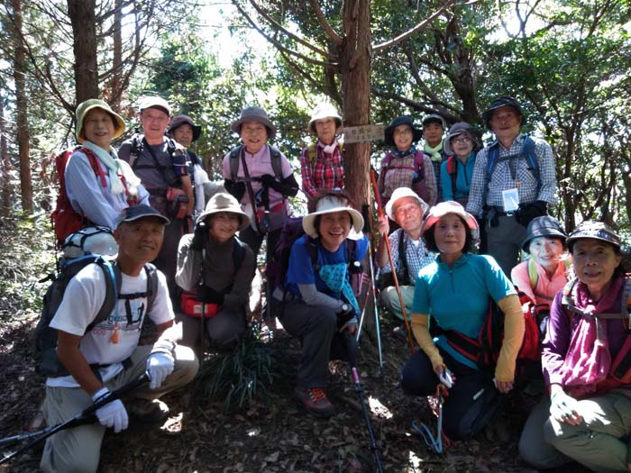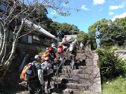 ◆参加者 L 高平レ 中ノ瀬・久保ク・井上・高平ノ・本村・尾上 会員7名 一般10名 ◆コース・その他 真っ青な秋晴れの下、野母半島の山へ踏み入る。めったにあるくことのない山なので。 登山道は少し荒れていたが。涼しい秋風に吹かれながら快適な山歩きが出来た。 下山後は観音寺にお参りし、有名な天井絵を見せていただく・ 10:15 自己紹介や準備運動の後出発 11:20 殿隠山山頂 12:05 遠見山 山頂〜12:50 14:10 観音寺バス停にて解散 |