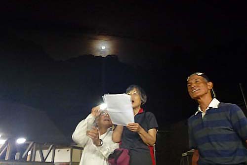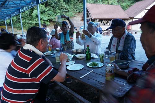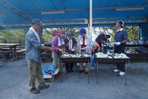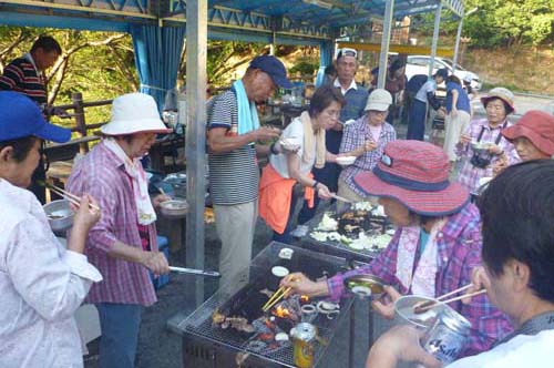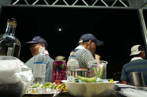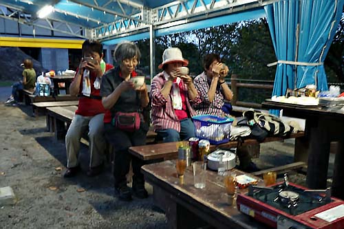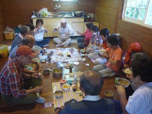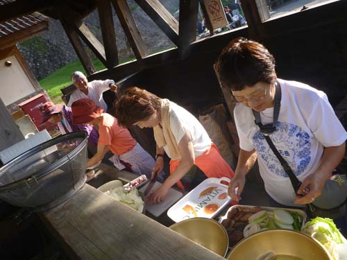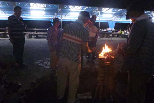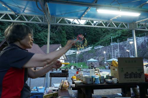 夕日に照らされながら準備 一番熱い仕事は田中さんのご飯炊き