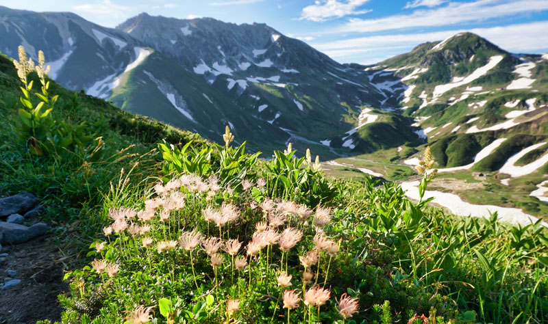 穂になったチングルマ 雪渓が残る立山・室堂 右奥浄土山