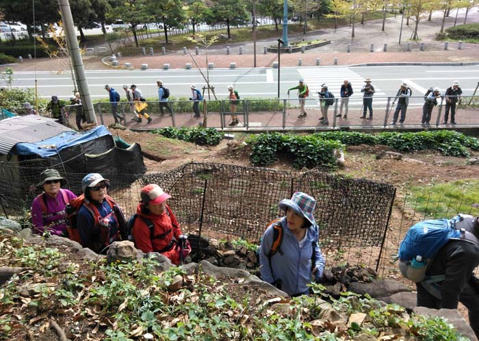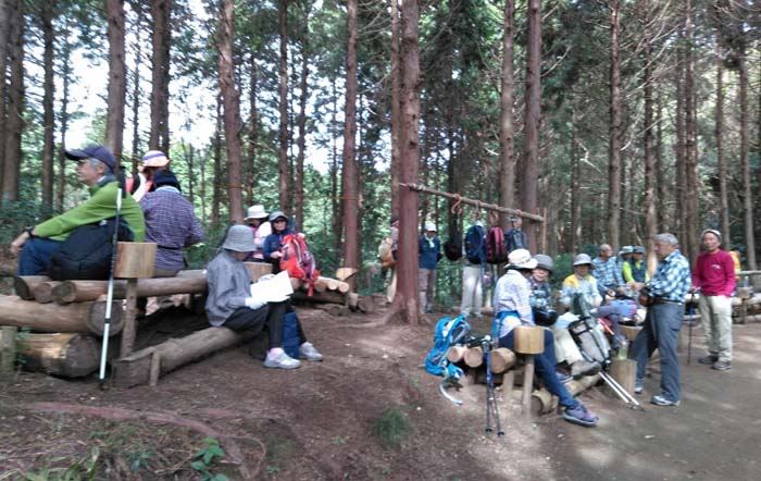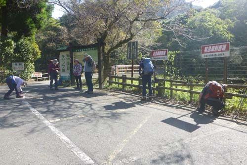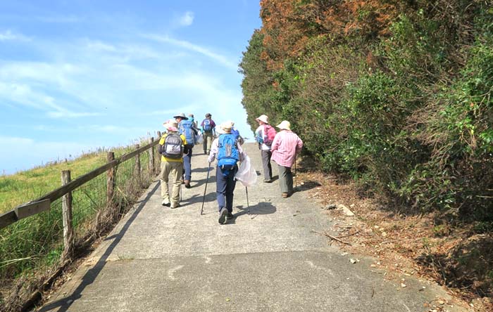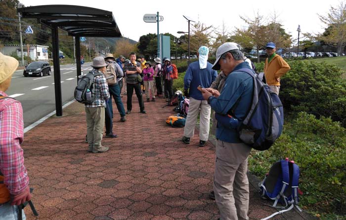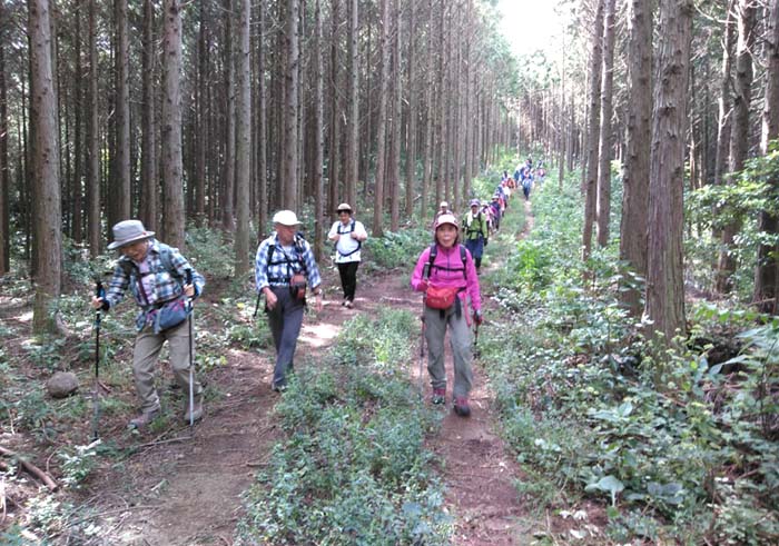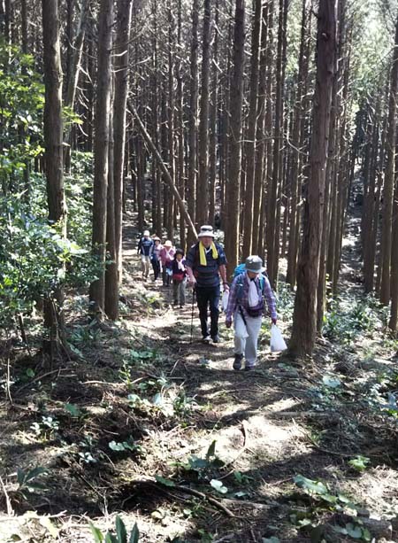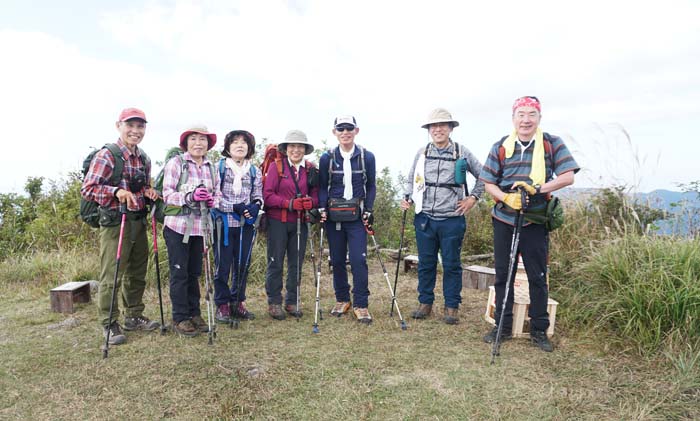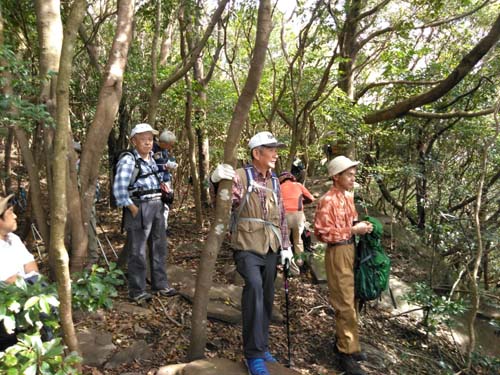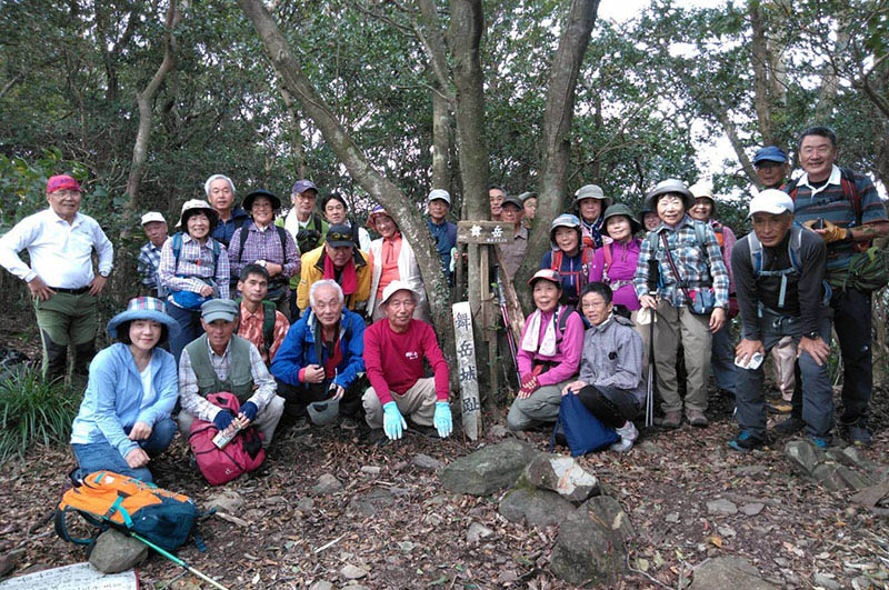 ★参加者 L高平令子 田中オ・松尾ア・久保ヒ・久保ク・松尾ノ・清水・尾上・松雪 会員10名 一般 22名 ★ コース 長崎市運動公園(柿泊)10:30~十郎岳尾根10:45~軽井沢11:25~いっぷく茶屋 昼食12:05~出発12:35~ 舞岳山頂13:30~式見ダム分岐14:05~上浦バス停解散14:25 ★その他 秋晴れの天気も手伝い、思いがけない大人数で出発。立ち寄るはずの十郎岳にはスズメバチが発生。 寄るのを諦め軽井沢で休憩。通称いっぷく茶屋で昼食休憩する。 岩屋山常連の方々の手作りベンチでまだ作業は続いている。急騰のガレ場を登り舞岳山頂へ。 一人の落伍者もなく、上浦バス停で解散。 |