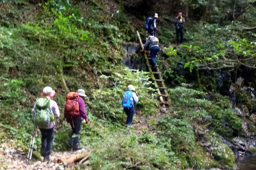 ★参加者 L松尾ノ 酒井マ・酒井ミ・ 井川ノ・ 井川キ ・清水 ・松雪 7名 ★ コース 矢谷渓谷キャンプ場9:55~林道出合~穴川出合~八方ケ岳12:40~13:30~ピストン・矢谷渓谷キャンプ場着15:30 矢谷渓谷キャンプ場の一番手前の駐車場から松尾ノさんをトップに歩き始める 。がラ場はあるが登山道は整備されており、歩きやすい。 |