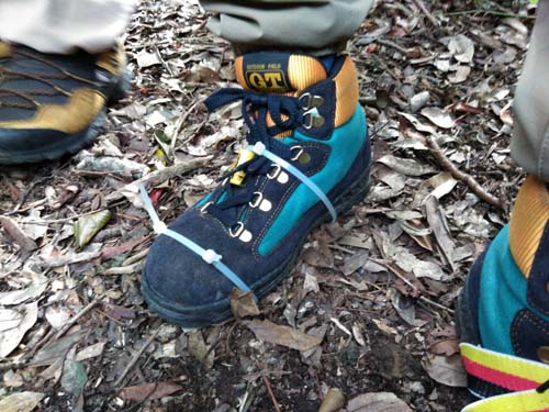 | 舞岳下山 滑りやすいガレ場です | ソールが剥がれた登山靴の応急処置 結束バンドで |