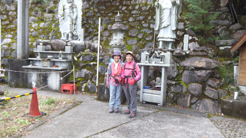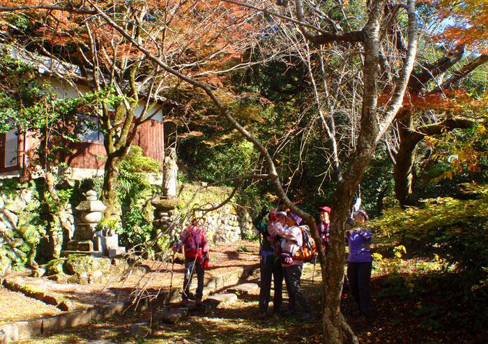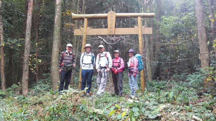 | 悪所岳上宮にお祀りされている八天宮の鳥居をくぐって下山 | 途中の林道をはさんで写真を撮りあいます |