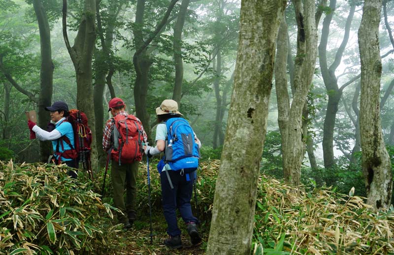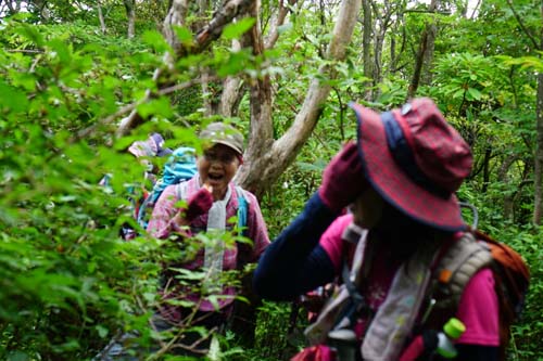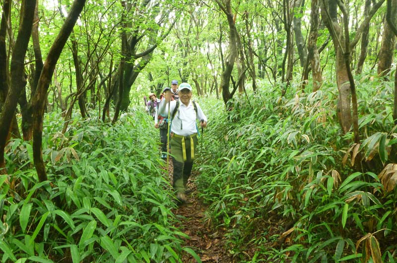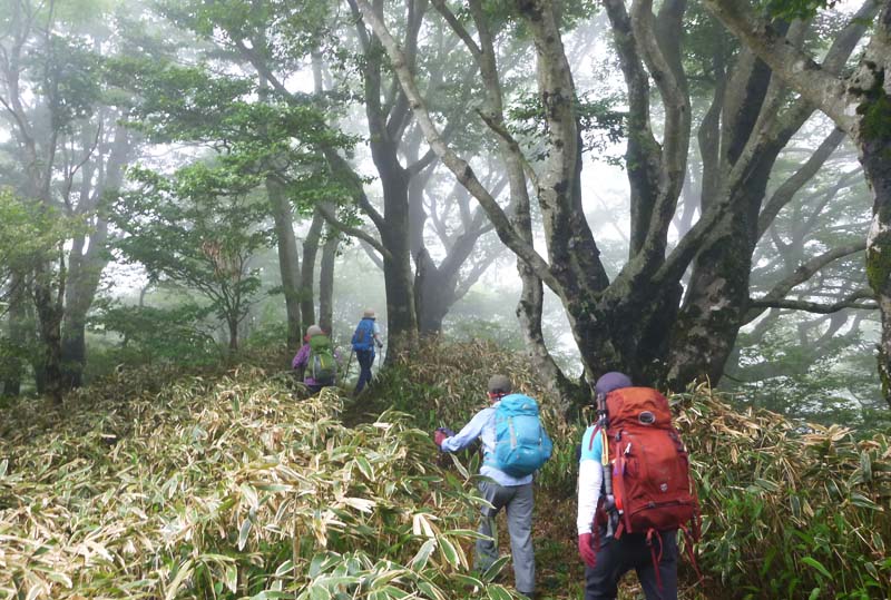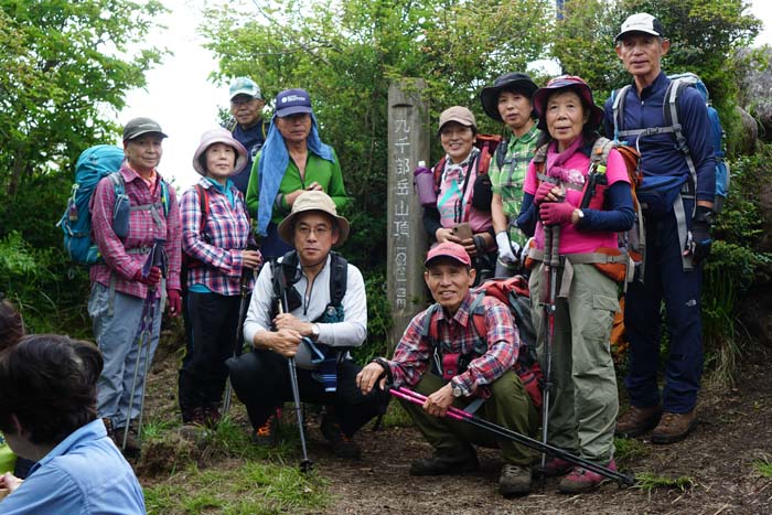 ◆参加者 L 久保博昭 田中オ・松尾ア・酒井マ・酒井ミ・久保ク・井川ノ・井川キ・井上・松雪 会員10名 一般笹井さん ◆コース 田代原(9:55)~九千部岳山頂~東尾根へ~田代原(14:25) 登山口の田代原から山頂付近まで時折日も射しいい天気、山頂手前の展望岩では谷筋はヤマボウシで 埋め尽くされています。 ところが山頂からはガスって見えません。 山頂から正面尾根を下るか田中オさんから・・・誰も賛成の手が上がらず東尾根を丁寧に下る。 |