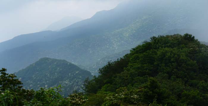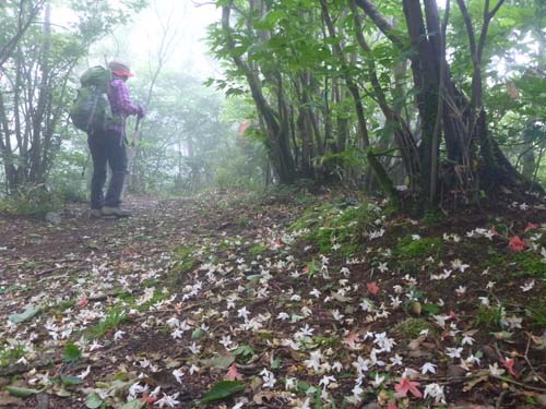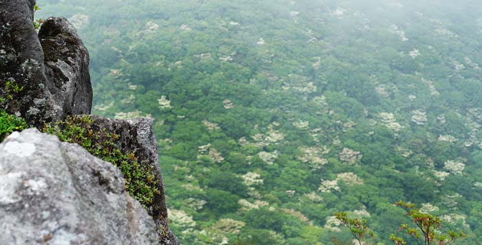 | 山頂から向こうの谷筋にヤマボウシがパッチワークのようでした |